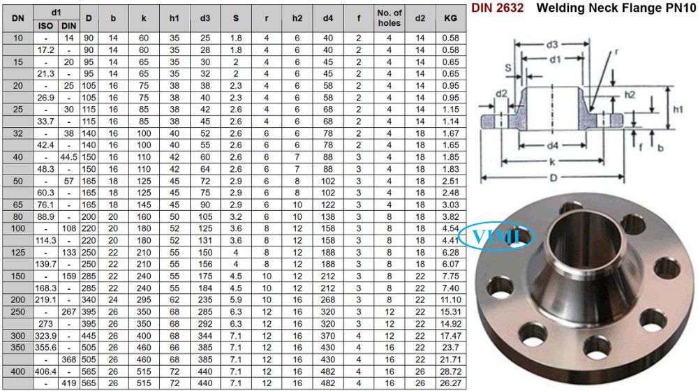 DIN 2632 là tiêu chuẩn mặt bích DIN của Đức quy định về mặt bích cổ hàn (Welding Neck Flange) với cấp áp suất PN10 (10 bar).