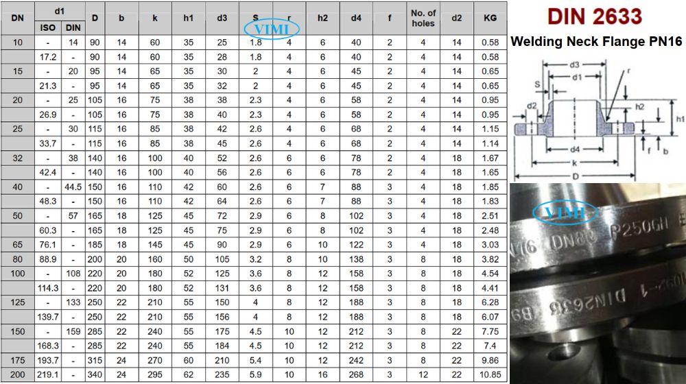 DIN 2633 là tiêu chuẩn mặt bích DIN của Đức quy định về mặt bích cổ hàn, có tên tiếng anh là Welding Neck Flange ở cấp áp suất PN16 (16 bar). Khác với mặt bích slip-on tức mặt bích hàn trượt thông thường