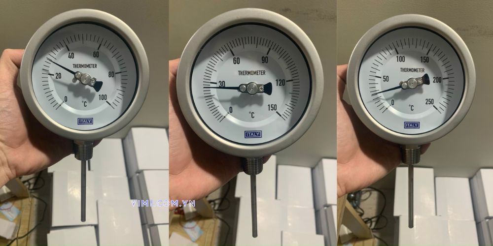 Ở khung nhiệt phổ biến hơn, đồng hồ đo nhiệt độ Italy ở mức đo giới hạn 100oC, 150oC, 250oC được sử dụng phổ biến và đa dạng cho các môi chất từ nước, dầu, hơi nóng. Người ta sử dụng đồng hồ đo nhiệt độ Italy để kiểm soát nhiệt độ không vượt quá mức giới hạn cho phép cũng như đảm bảo khung nhiệt độ ở mức ổn định nhiệt