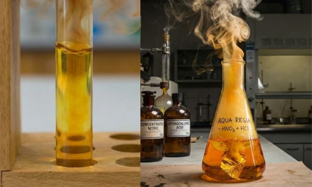 Nước cường toan được pha theo tỷ lệ 3:1, tức là 3 phần axit HCl trộn với 1 phần axit HNO₃. Khi hai axit trộn vào nhau, chúng tạo ra NOCl và Cl₂ là hai chất oxy hóa mạnh có khả năng phá vỡ bề mặt vàng và hình thành phức chất AuCl₄⁻ tan được